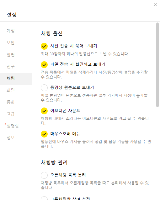 채팅 탭에서는 사진 전송 시 묶어 보내기, 파일 전송 시 확인하고 보내기, 이모티콘 사운드 등을 설정할 수 있고 파일 다운로드 시에 저장되는 폴더를 변경할 수 있습니다.